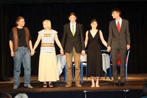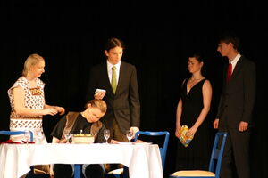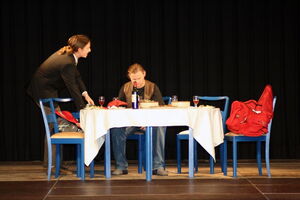 Es geht um einen "hohen Posten", den sich der aalglatte Ortwin ohne Probleme "erschleimen" könnte, wäre da nicht seine Ehefrau. Elke läßt mit Sicherheit kein Fettnäpfchen aus, ob es sich nun um fallengelassene heiße Kartoffeln, Verdauungsstörungen oder aufgestellte Mausefallen handelt, die dem unglücklichen Dr. Hengst die Hände quetschen. Auch der Schwiegervater trägt dazu bei, daß dieses "Dinner for five" in einer Katastrophe endet...